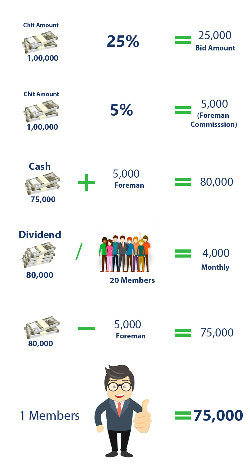 Foreman commission is 5% on 1,00,000 which is 5,000. First two month this 5,000 commission goes to the company, which is collected 5,000 from our customers Rs.250 (250 * 20 = 5000).